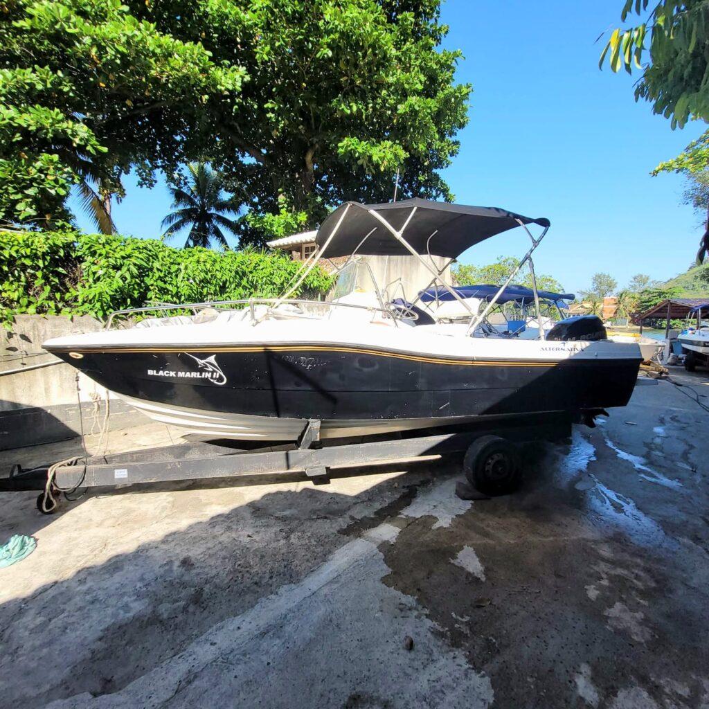 Lancha Alternativa Marlin 19 ( Projeto do Joachim Kusters – Carbrasmar), Motor Mercury Optimax Proxs 2T 115 com 325 hrs, Motor e casco ano 2016, Mar Aberto + Raymarine Gps Sonar Dragonfly 4 (faltando o transducer) +Rádio + Bomba agua doce + 2 bombas de porão + Tanque de água doce + Rádio VHF (Precisa reparo) + Capota Bailly + Capa Bailly + Som, 4 alto-falantes + Salvatagem completa + Ancora de Proa e cabos +Solário de proa. + Carreta de encalhe