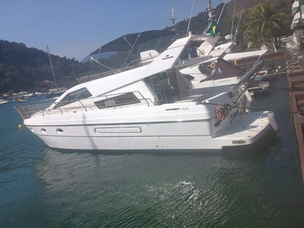 Lancha marca Intermarine, modelo Gold, ano 2002, cor branca, NIC-N° de Identificação do casco 42 u.467263, com 13,59 m de comprimento, com motor 1 Volvo 430 HP, 2002, com motor 2 Volvo 430 HP, 2002, com potência total de 1200HP.
